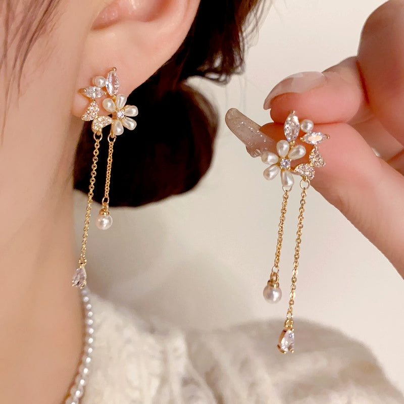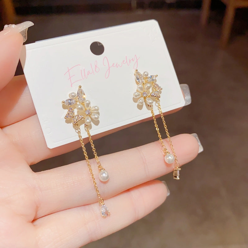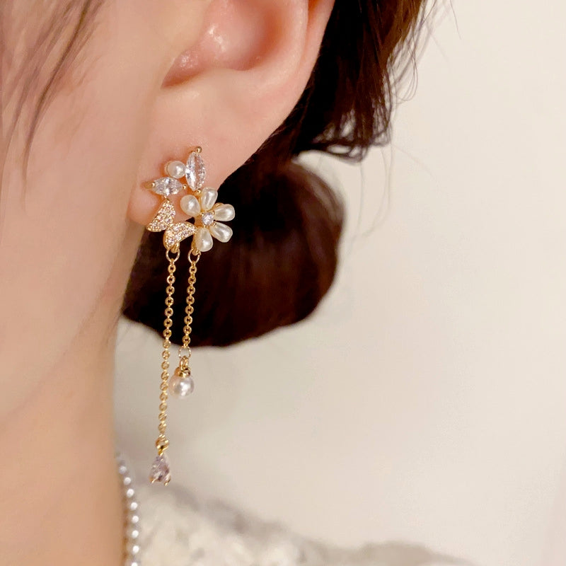 14K Gold-Plated Zircon Pearl Flower Earrings