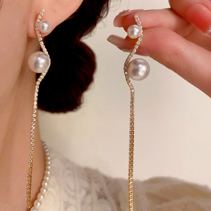 14K Gold-Plated Zircon Pearl Long Tassel Earrings