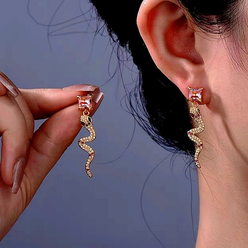 14K Gold-Plated Zircon Pink Diamond Snake Earrings
