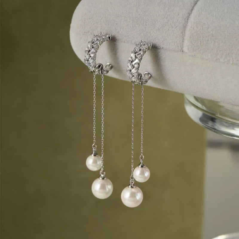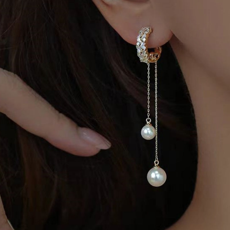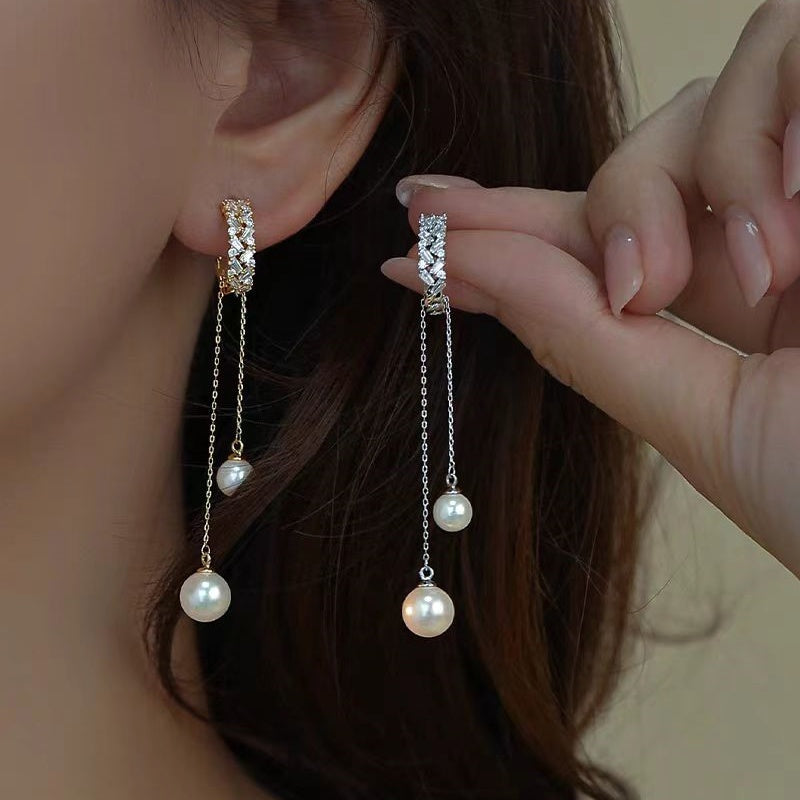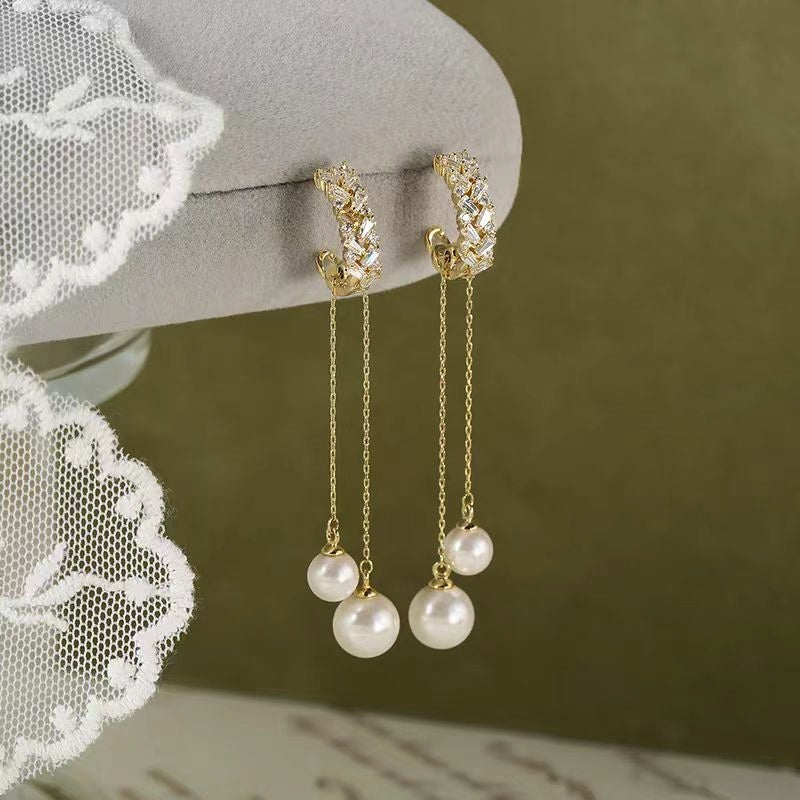 18K Gold-plated Elegant Zircon Long Tassel Pearl Earrings
