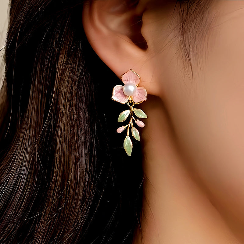 18K Gold-Plated Enamel Oil-Drop Flower Pearl Earrings