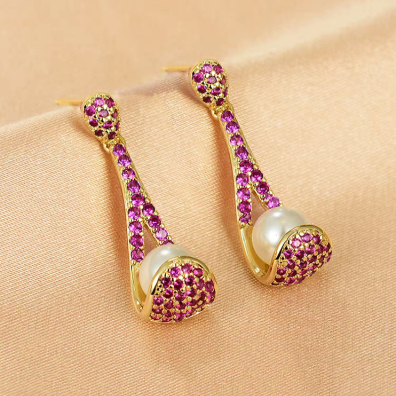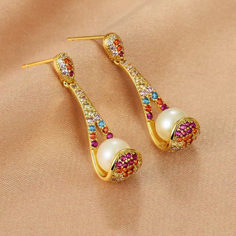 18K Gold-plated Zircon Colorful Spoon Pearl Earrings