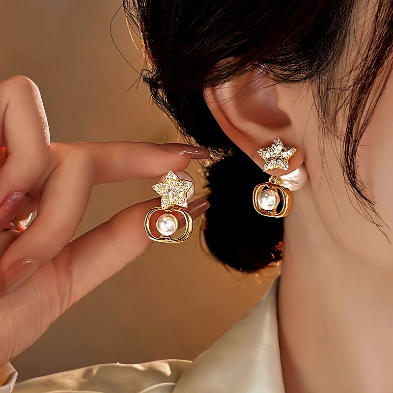 18K Gold-Plated Zircon Diamond Star Pearl Earrings