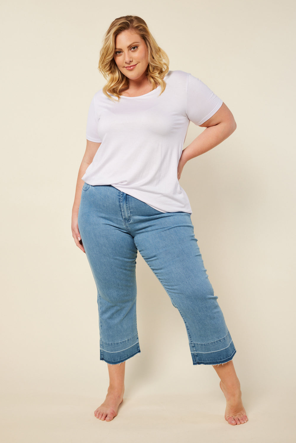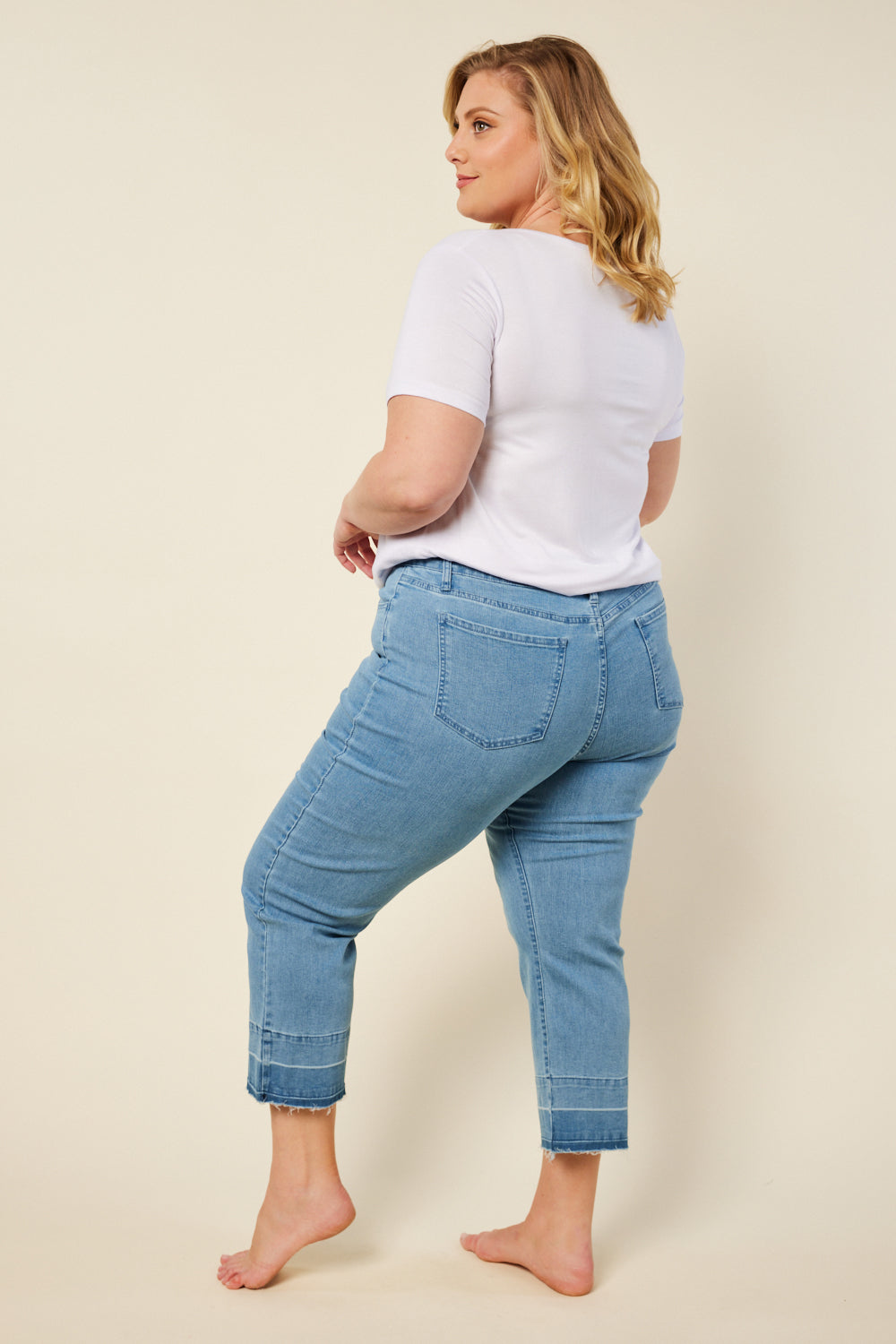 Now available in light blue, our Cropped Straight Jeans are the perfect addition to your wardrobe this season. Featuring a flattering high-rise waist and straight-leg cut, these stretch denim pants make a great choice for everyday wear. For a modern twist gold hardware, functional pockets e and a distressed hem have been added for subtle interest.