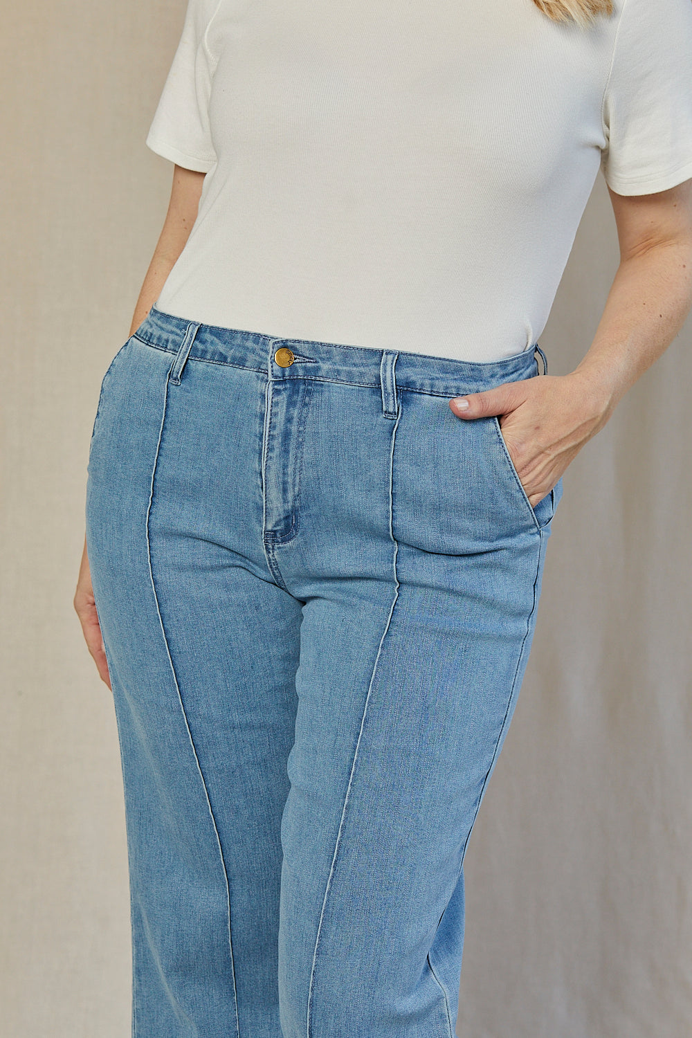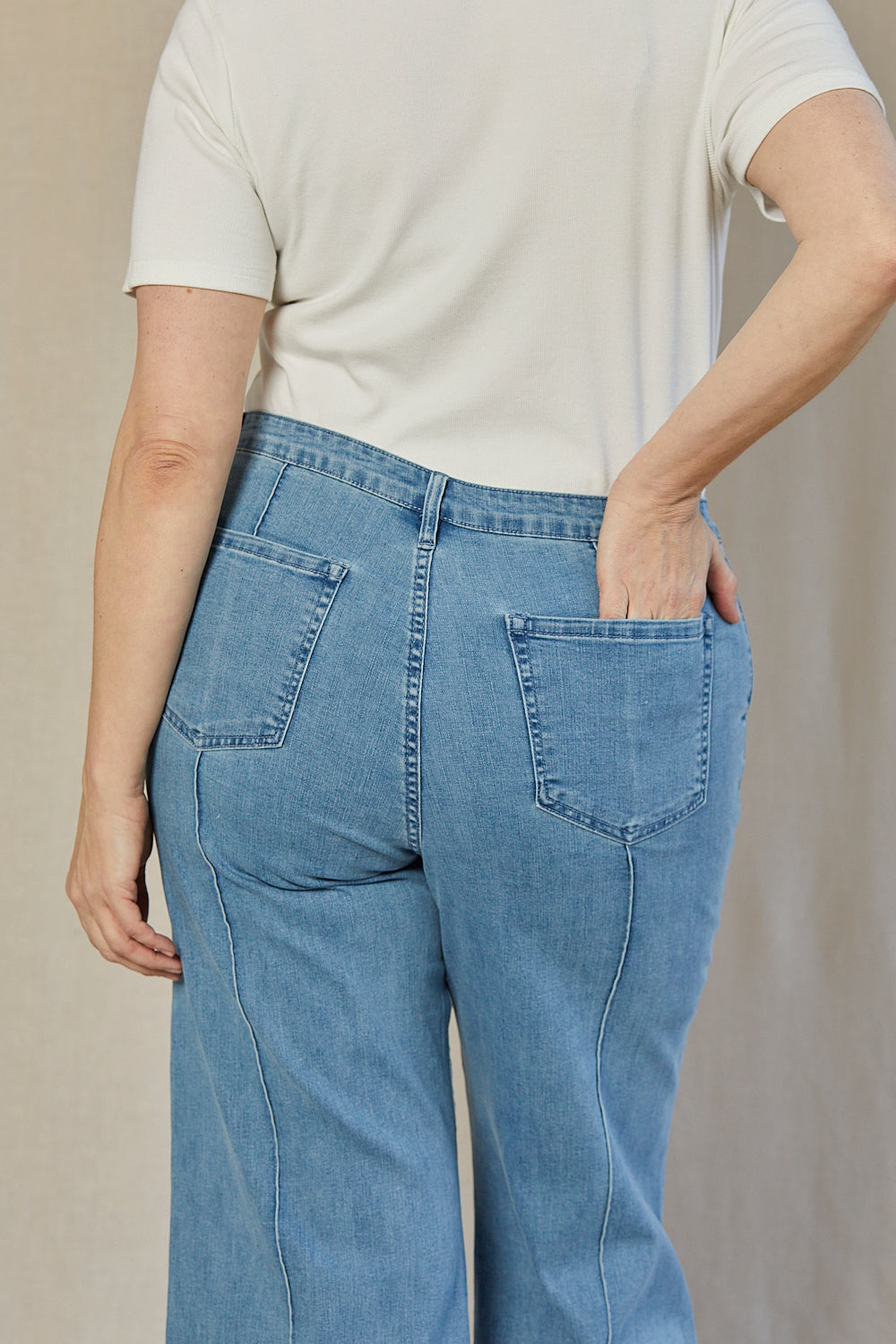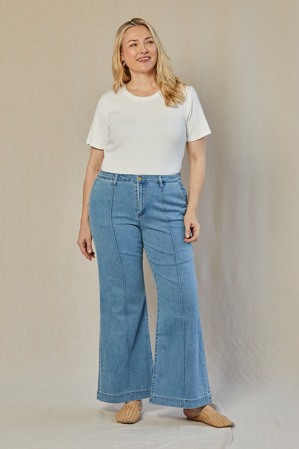 Feminine and retro, our Adrift Denim Wide Leg Jeans in Light Blue will be your go-to jeans for years to come. Crafted with a soft premium stretch cotton blend, these high rises, relaxed-fitting wide-leg jeans are the ultimate smart-casual jean to dress up or down. Finished with gold hardware and a tucked stitch embellishment along the front and back leg centre you'll be flooded with compliments!