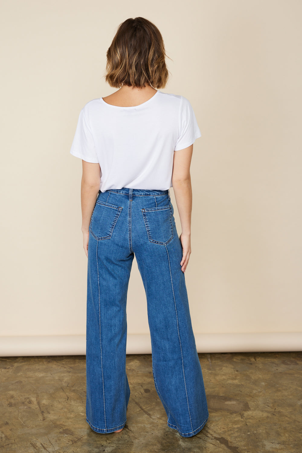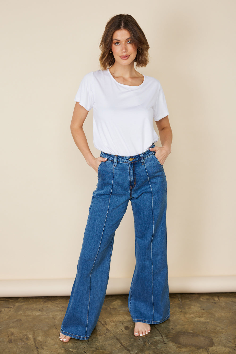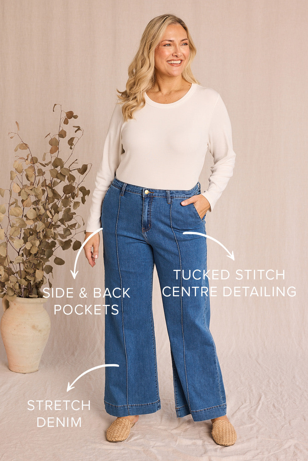 Modern design meets retro style our Adrift Denim Wide Leg Jeans will be your new best friend. Slightly contoured at the hip to a flattering flare at the ankles these jeans feature a tucked stitch at the front and back to elongate your legs.