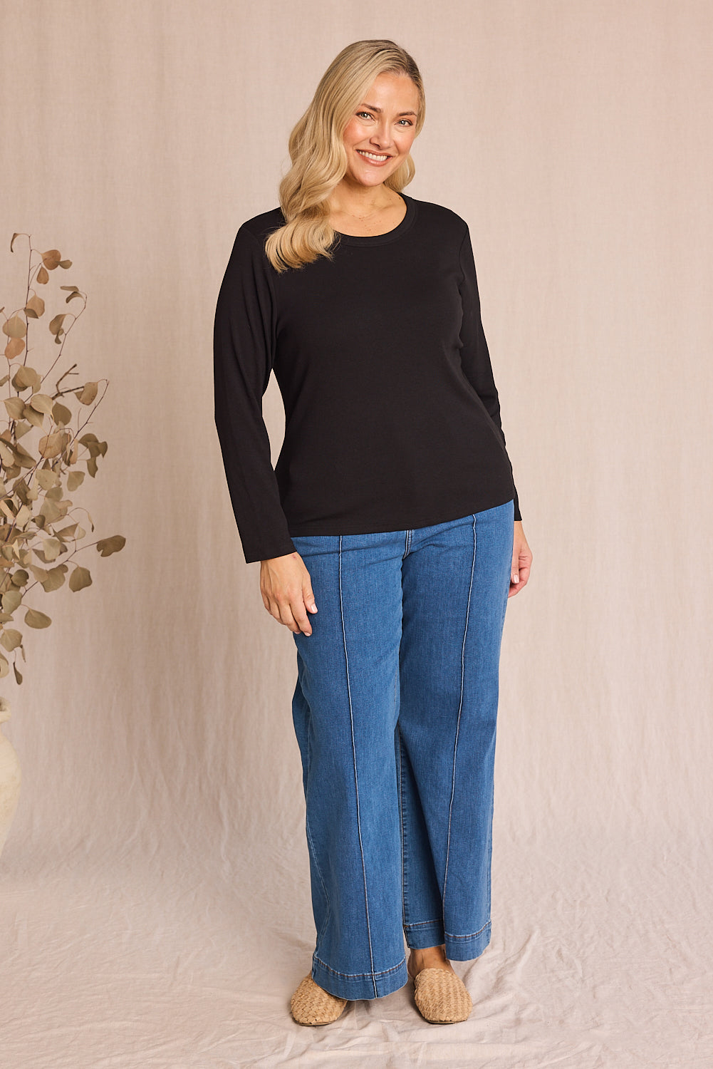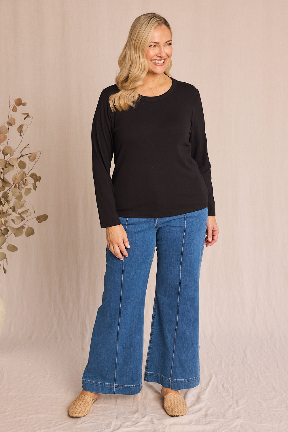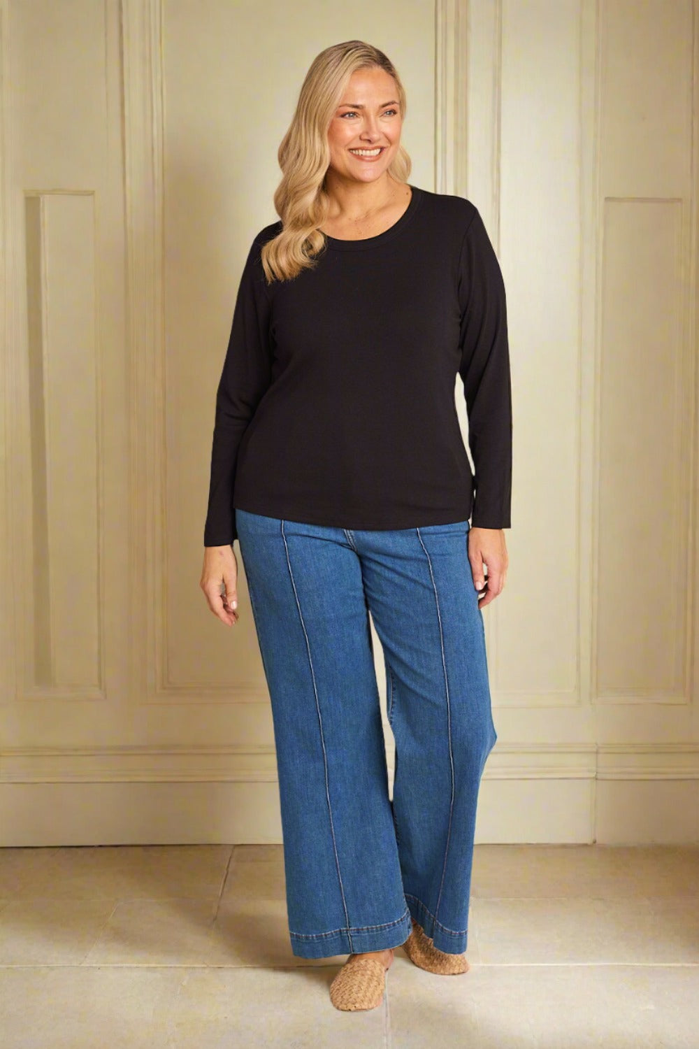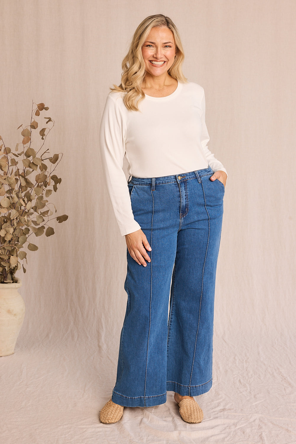 Modern design meets retro style our Adrift Denim Wide Leg Jeans will be your new best friend. Slightly contoured at the hip to a flattering flare at the ankles these jeans feature a tucked stitch at the front and back to elongate your legs.