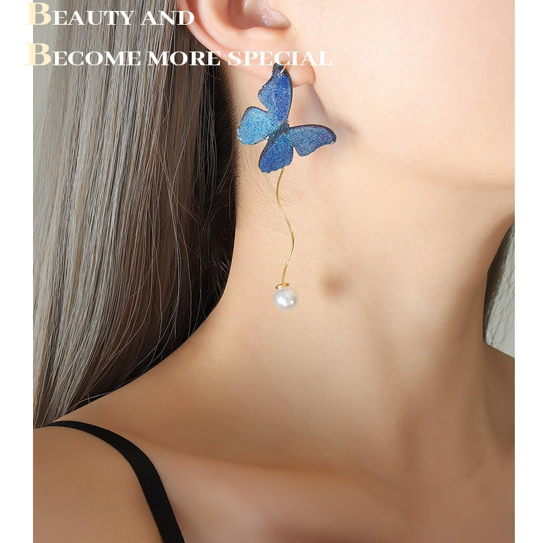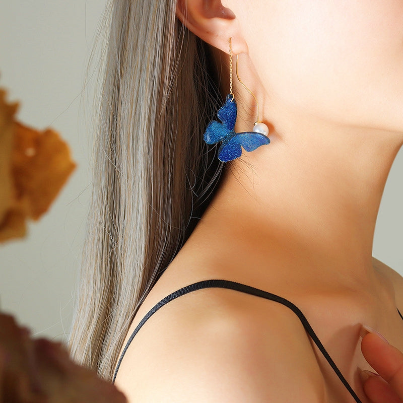 Blue Resin Butterfly Artificial Pearl Threader Earrings
