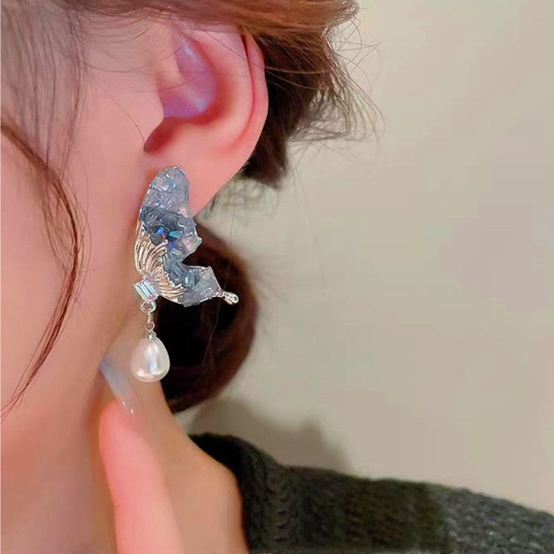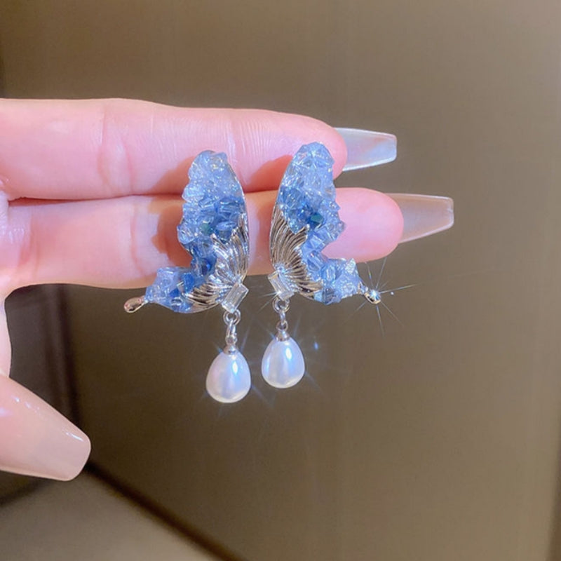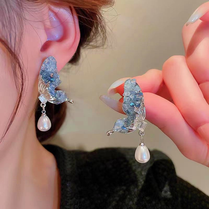 Silver Post 14K Gold-Plated Crystal Butterfly Drop Pearl Earrings
