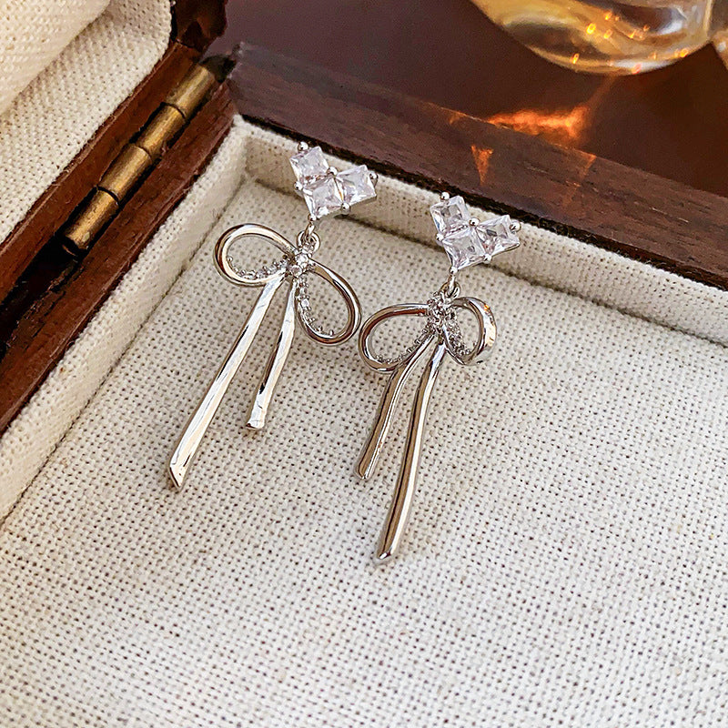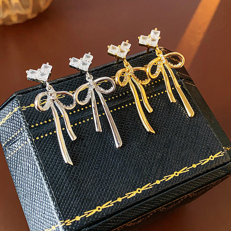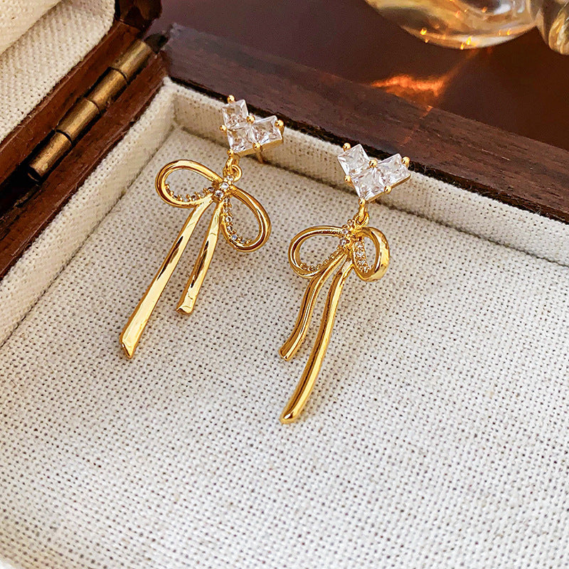 Silver Post 18K Gold-Plated Zircon Heart-Design Bow Earrings