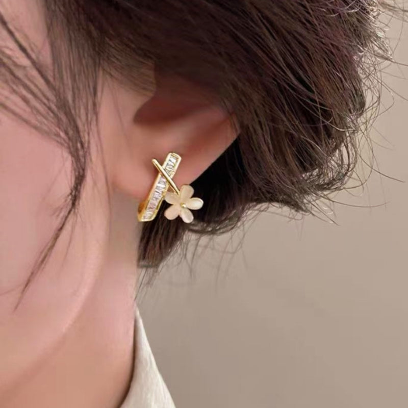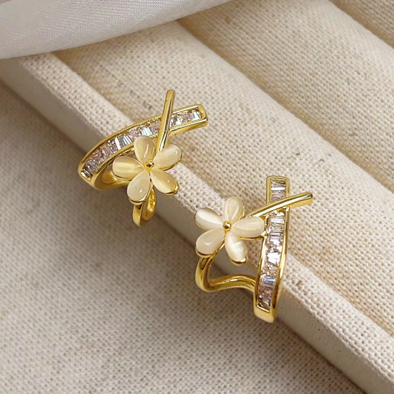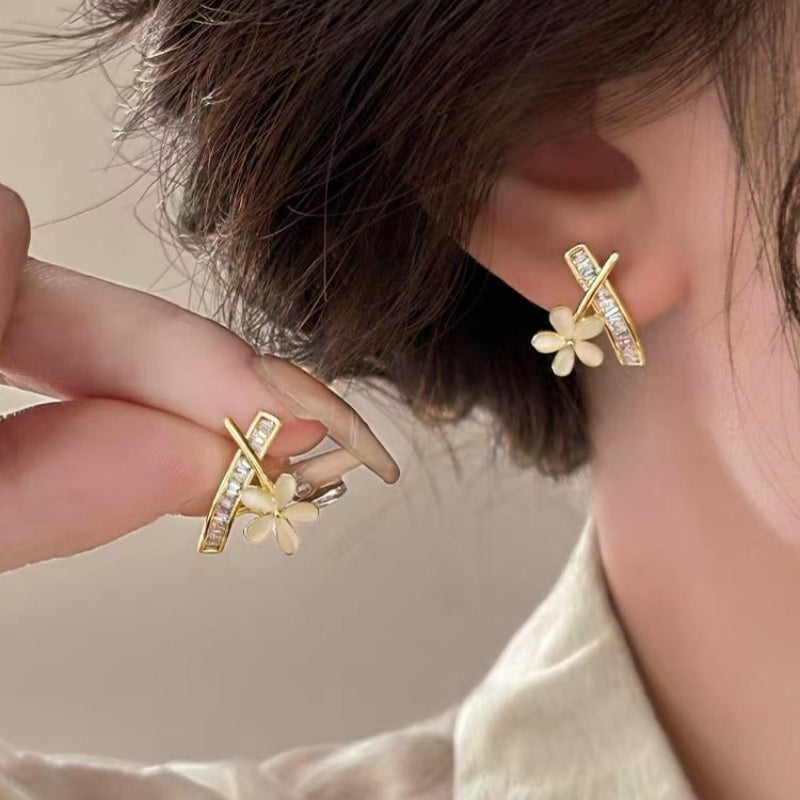 Silver Post Micropaved Flower Cat's Eye Cross Earrings