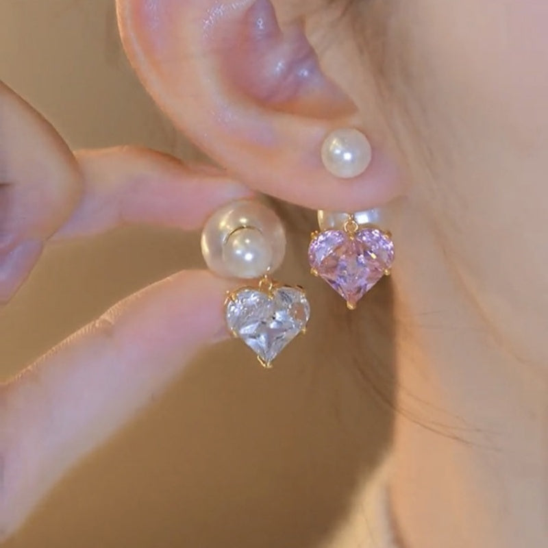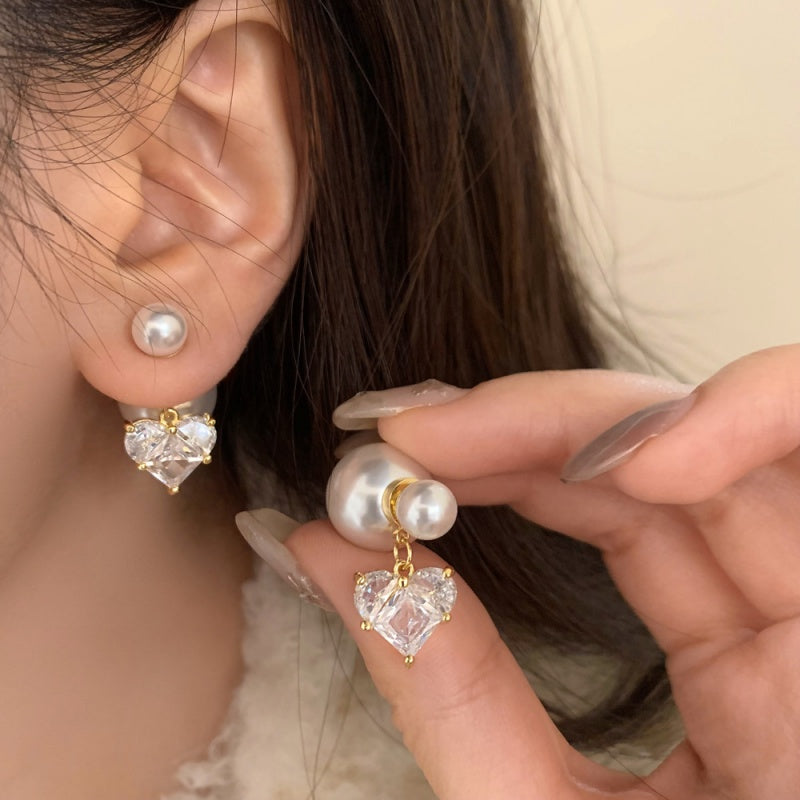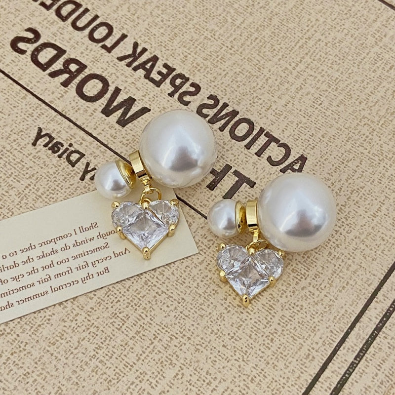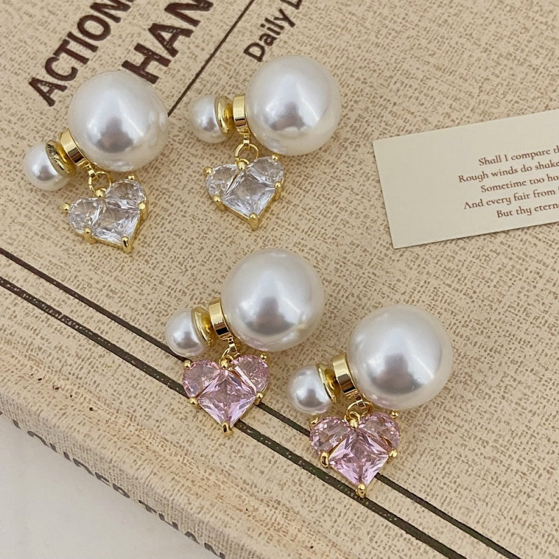 Silver Post Micropaved Zircon Heart Artificial Pearl Earrings