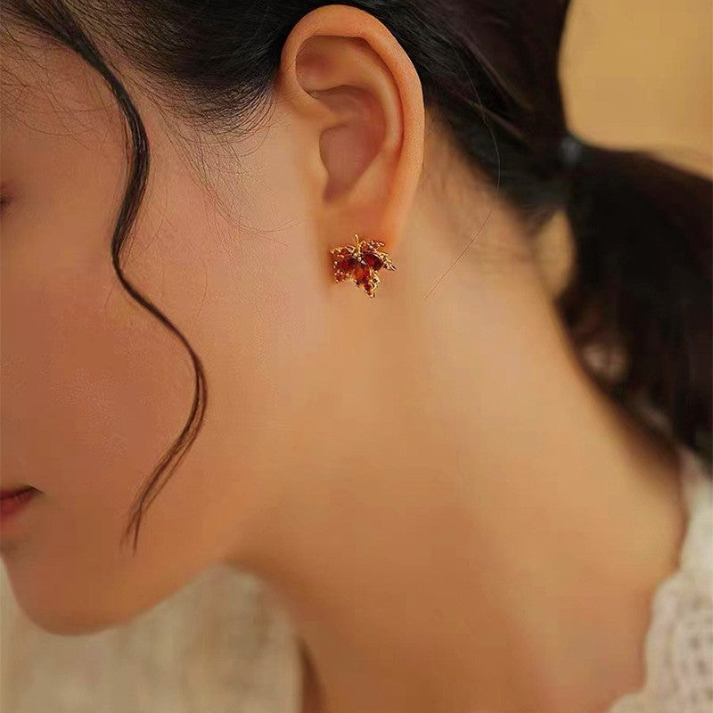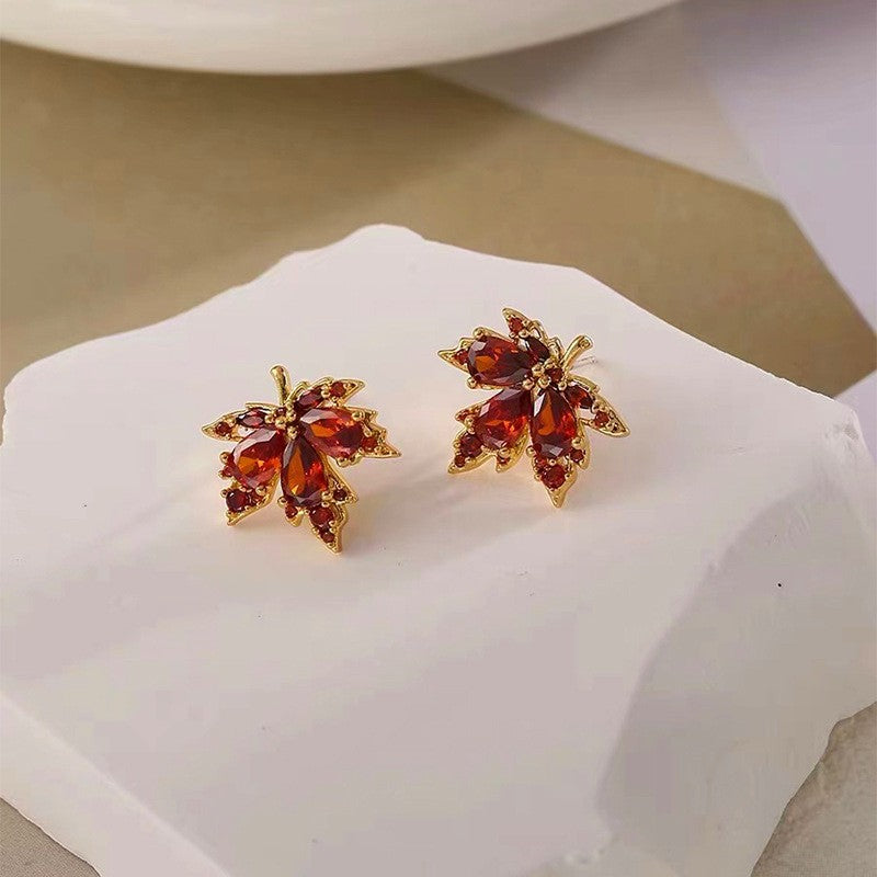 Silver Post Red Maple Leaf Stud Earrings