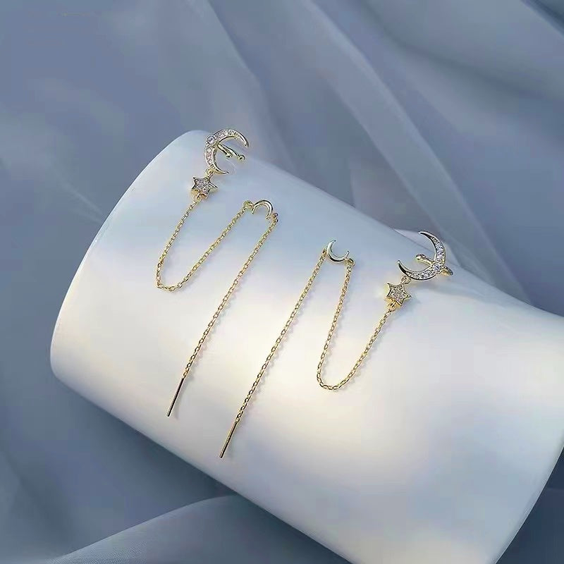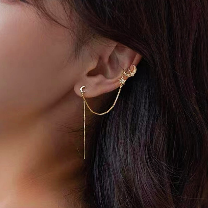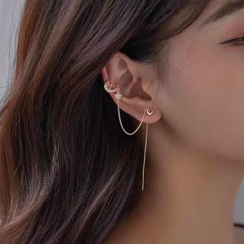 Silver Post Star And Moon Ear Cuff Clip Earrings