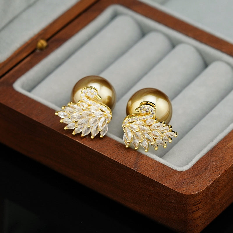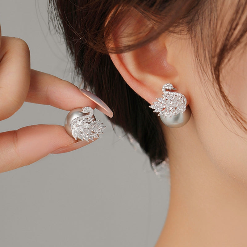 Silver Post Zircon Diamond Swan Pearl Earrings