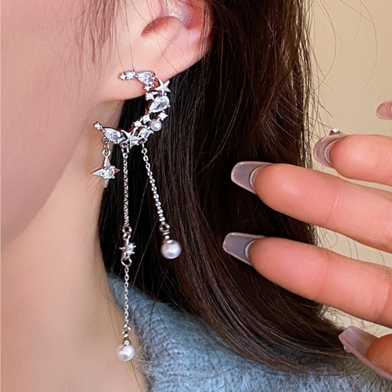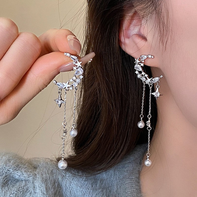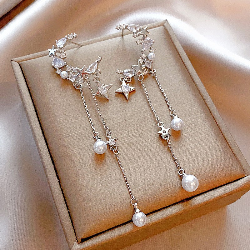 Silver Post Zircon Star Moon Pearl Earrings