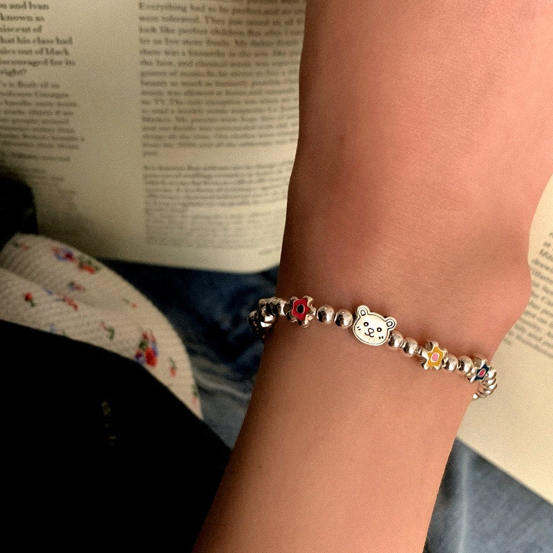 Sterling Silver Colorful Drip Glaze Flower Bear Beaded Bracelets