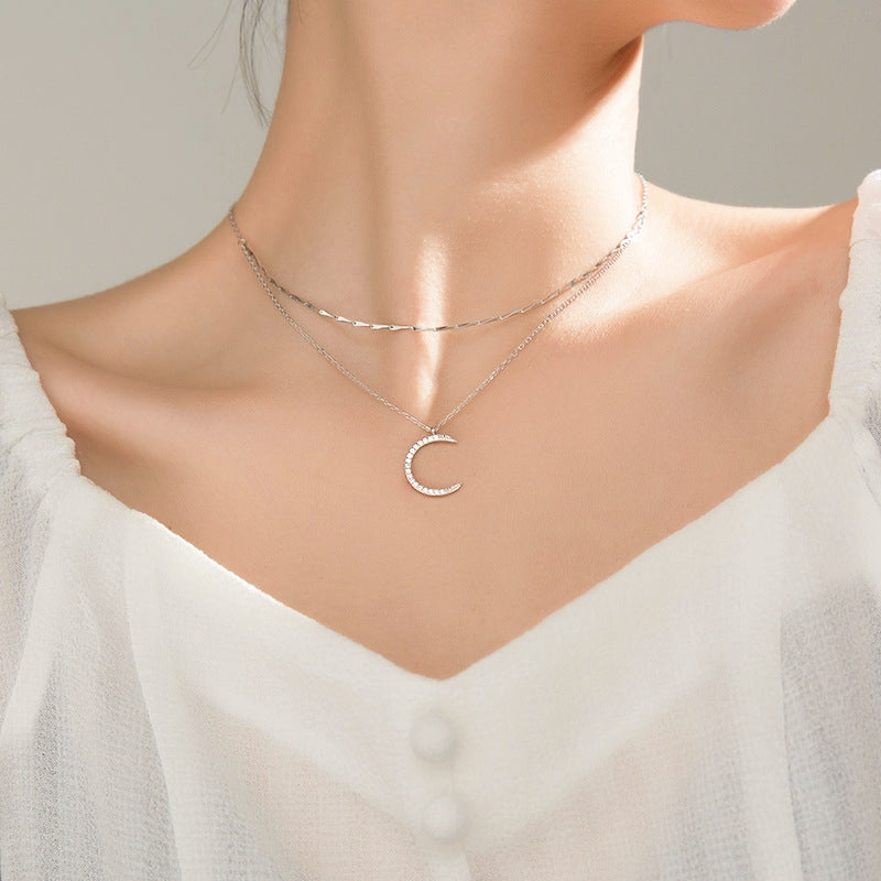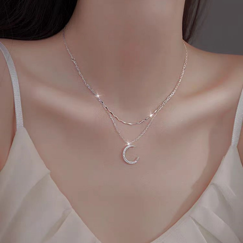 Sterling Silver Double-Layer Diamond Bling Moon Necklaces
