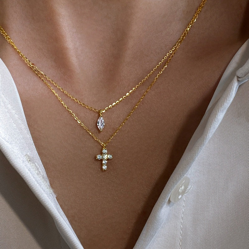 Sterling Silver Double-Layer Diamond Cross Necklace