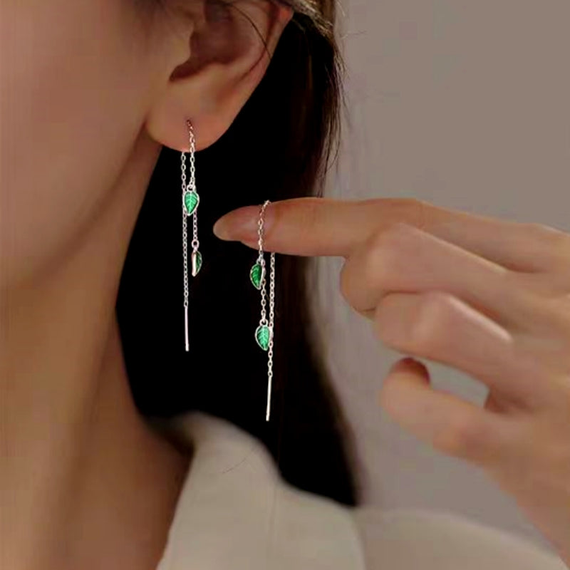 Sterling Silver Elegant Green Leaf Threader Earrings