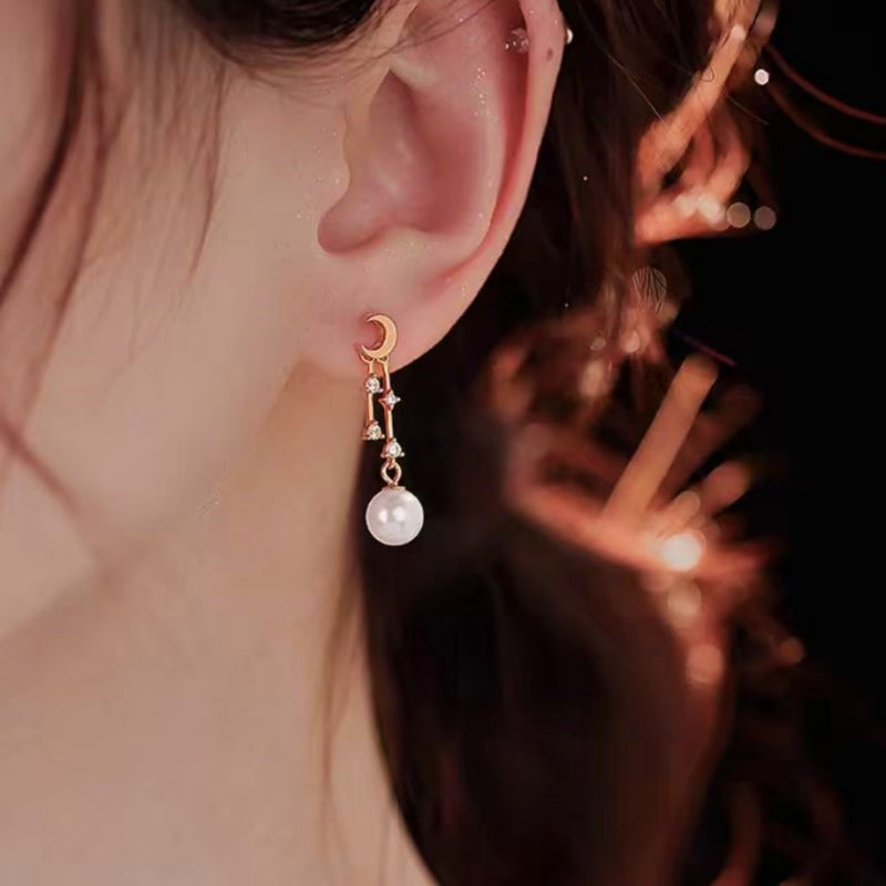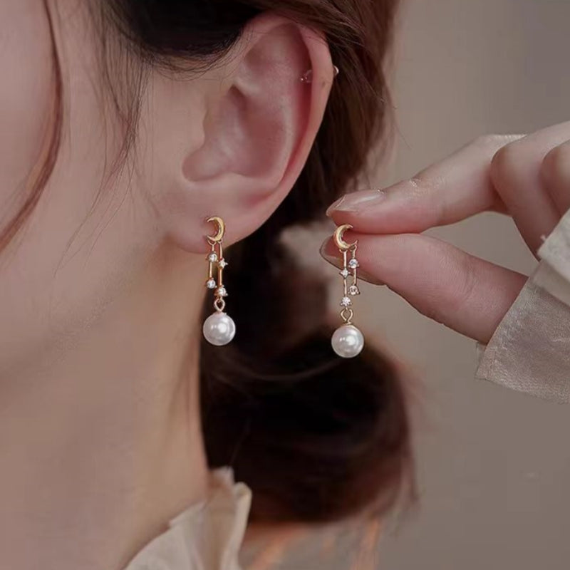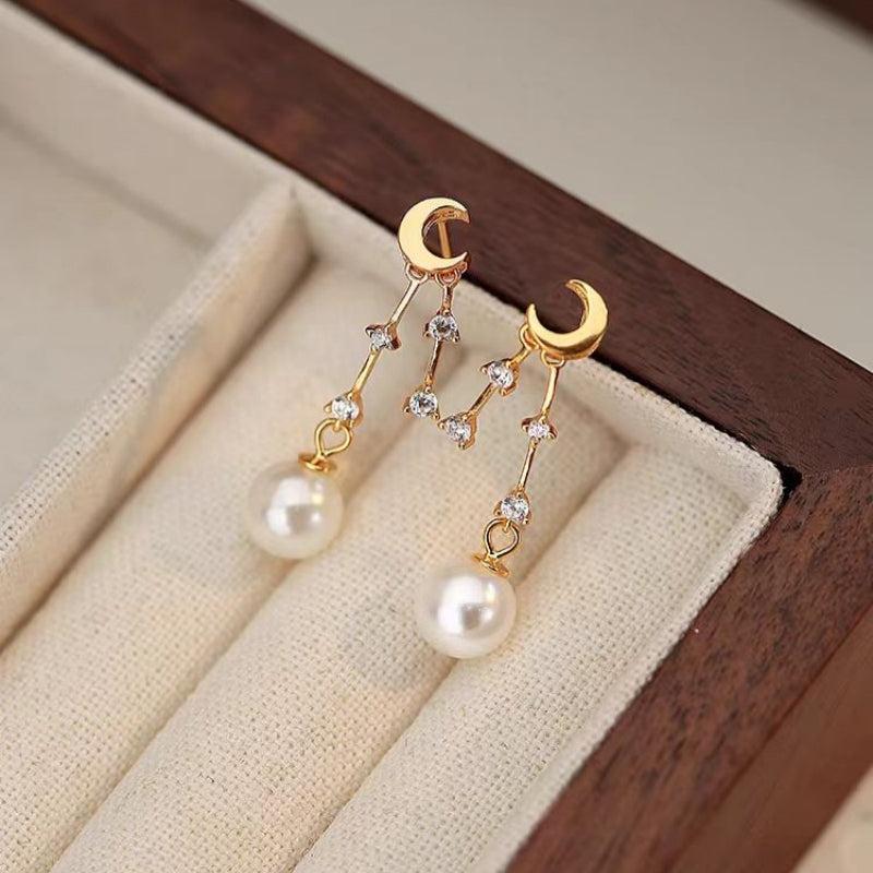 Sterling Silver Elegant Moon Star And Pearl Earrings