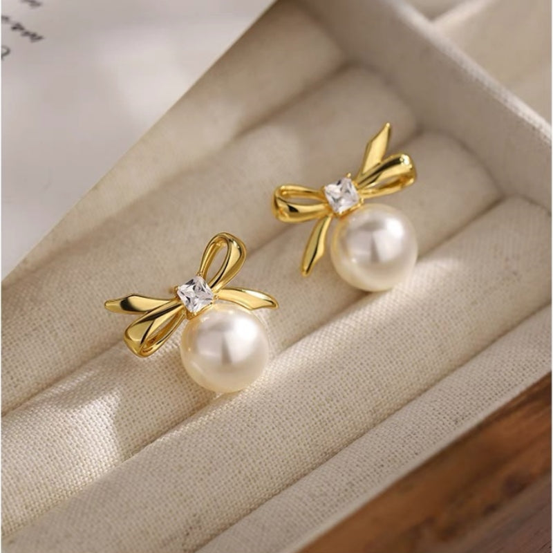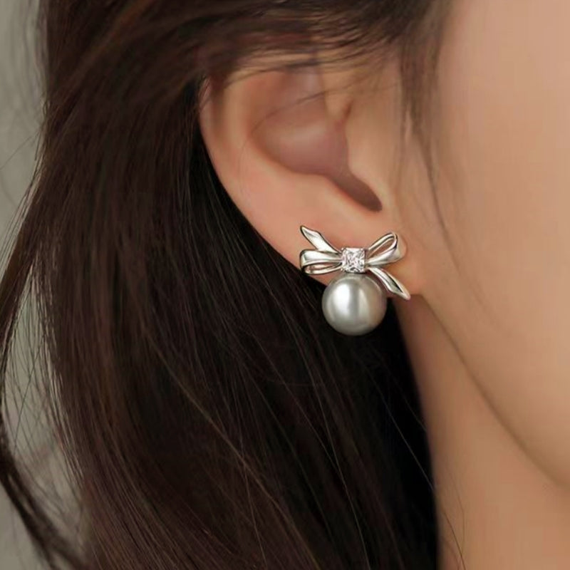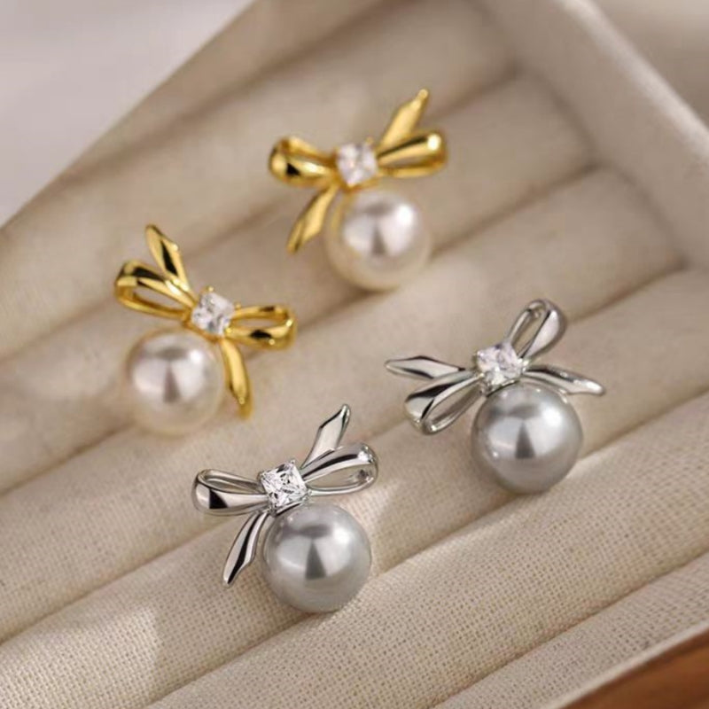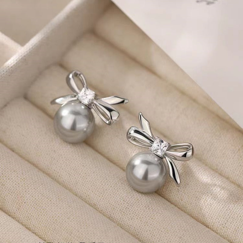 Sterling Silver Elegant Pearl And Bow Stud Earrings