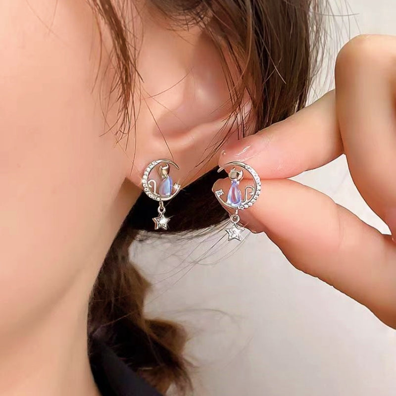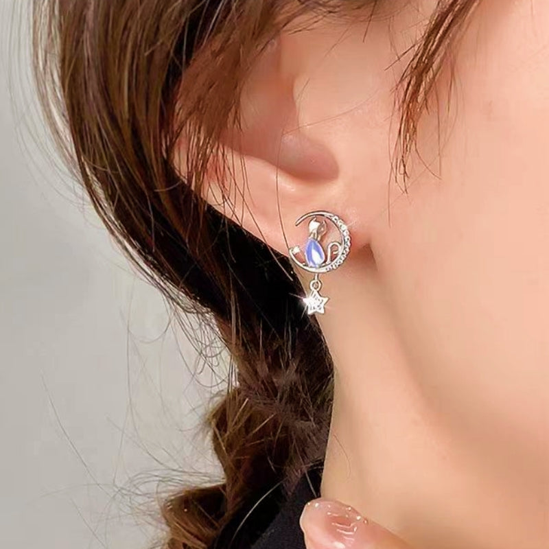 Sterling Silver Elegant Star And Moon Cat Stud Earrings