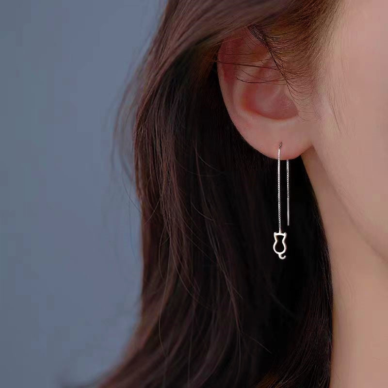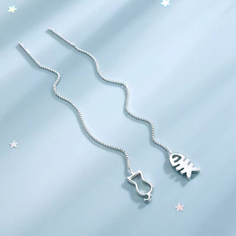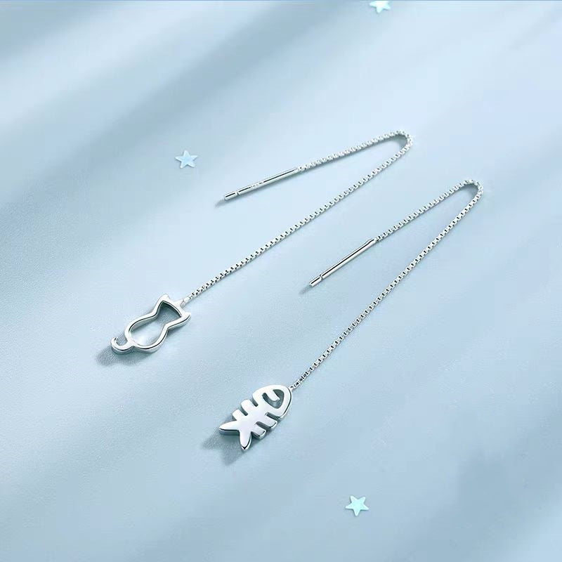 Sterling Silver Hollow Cat And Fish Threader Earrings