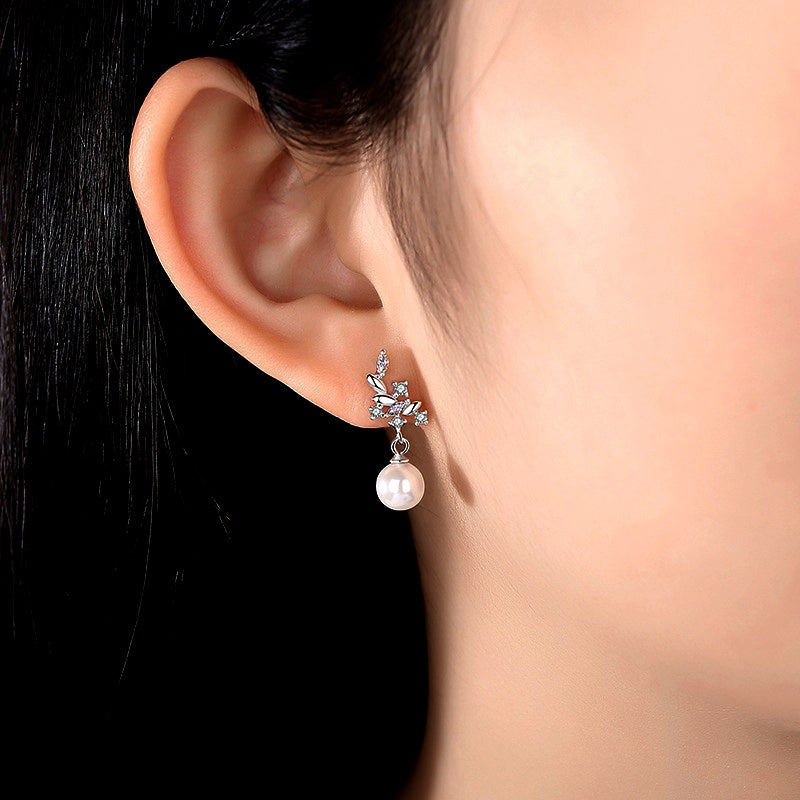Sterling Silver Leaf Artificial Pearl Earrings