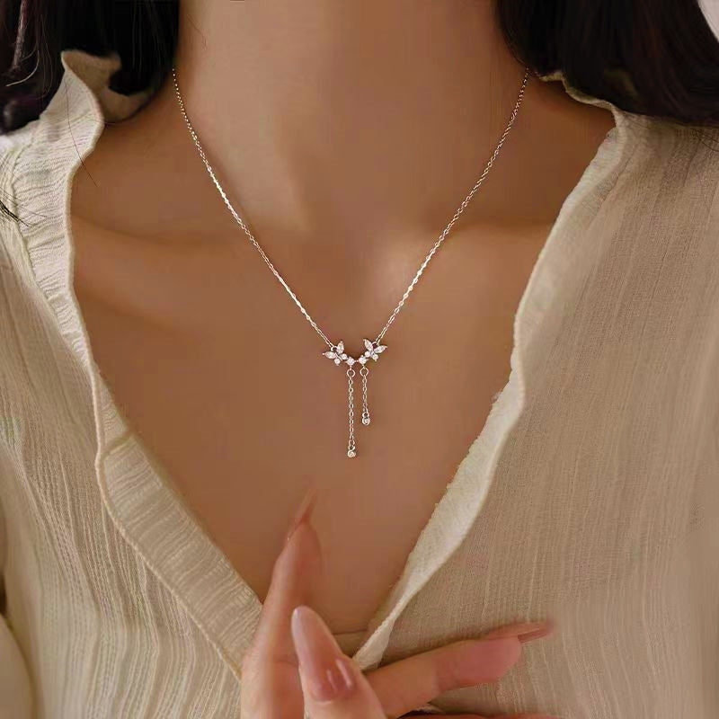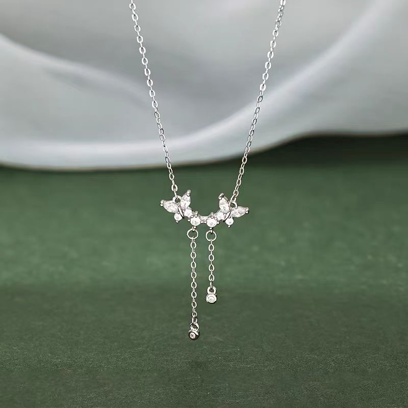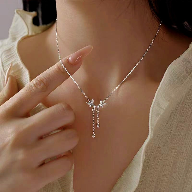 Sterling Silver Luxury Diamond Butterfly Tassel Necklaces