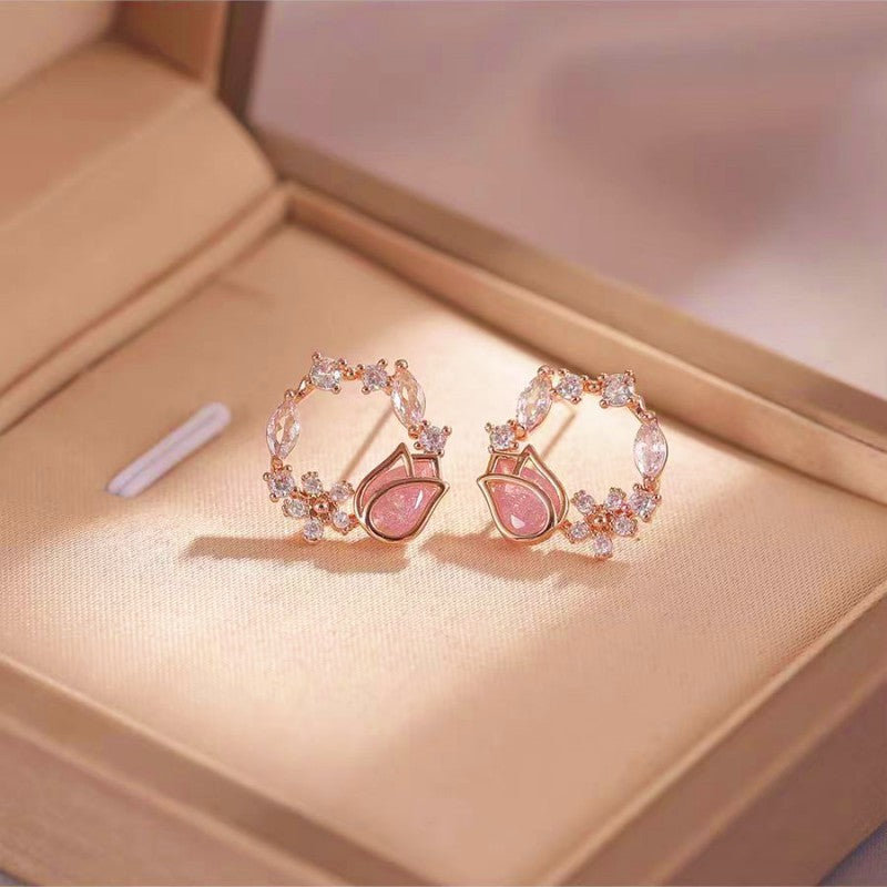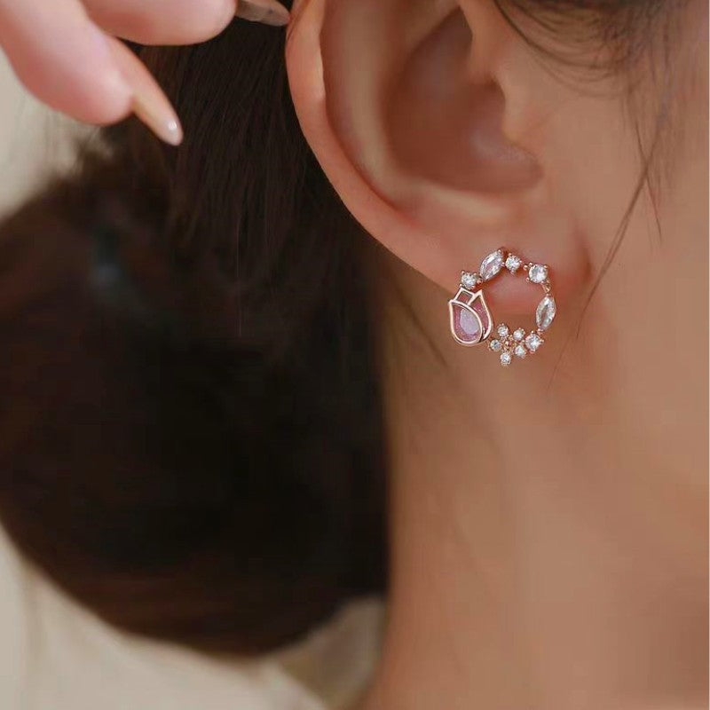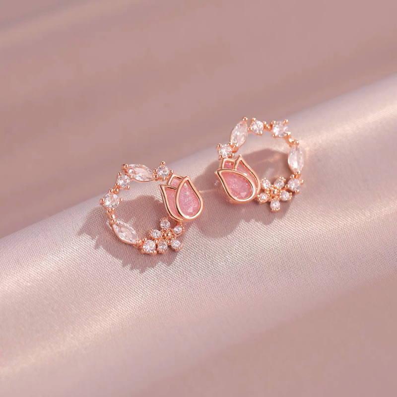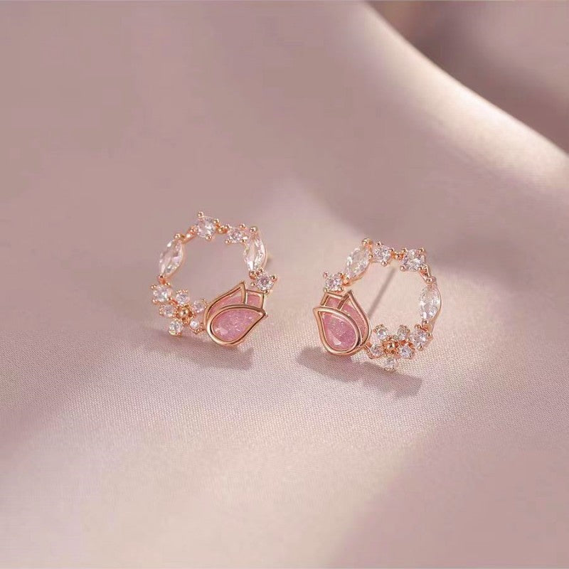 Sterling Silver Pink White Zircon Tulip Hoop Flower Stud Earrings