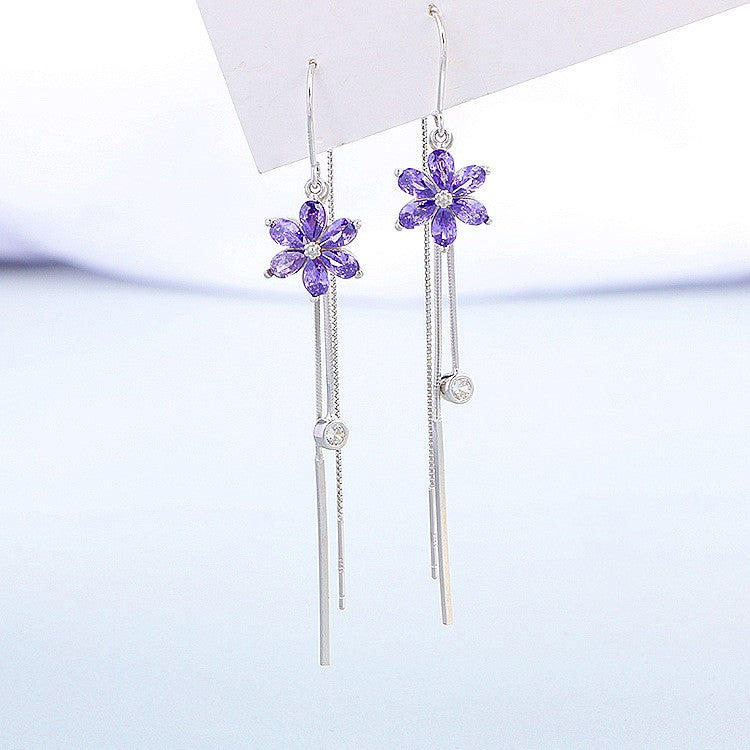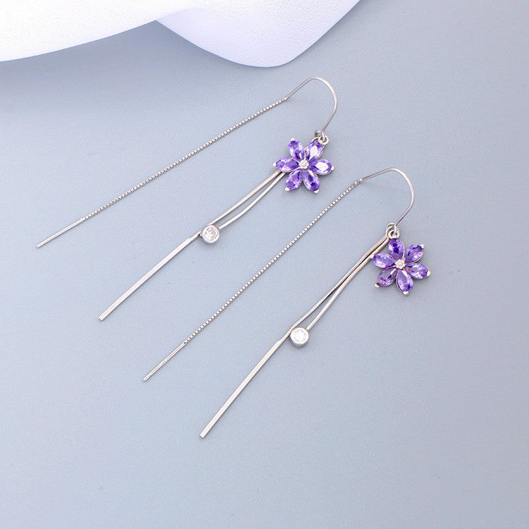 Sterling Silver Purple Zircon Flower Tassel Threader Earrings