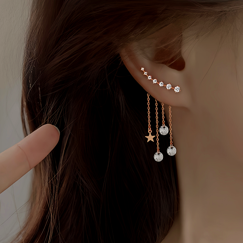 Sterling Silver Rose Golden Elegant Zircon Diamond Star Tassel Earrings