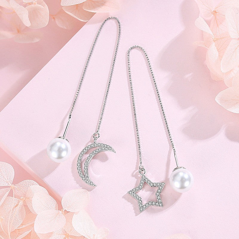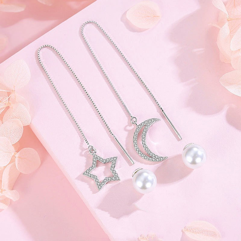 Sterling Silver Star And Moon Pearl Threader Earrings