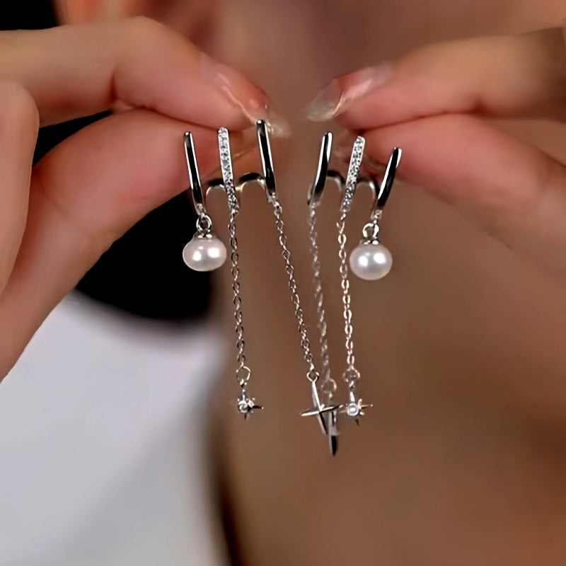 Sterling Silver Three-Layer Pearl Star Tassel Earrings