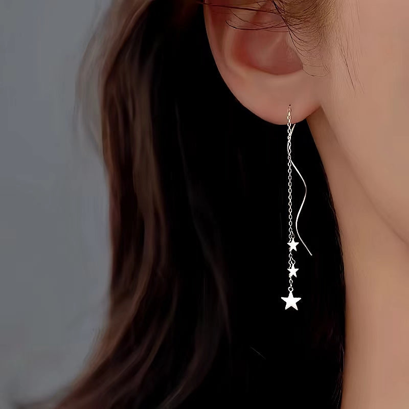 Sterling Silver Wavy Large And Small Star Threader Earrings