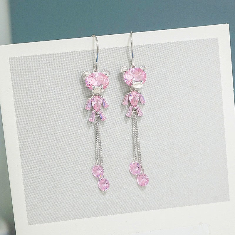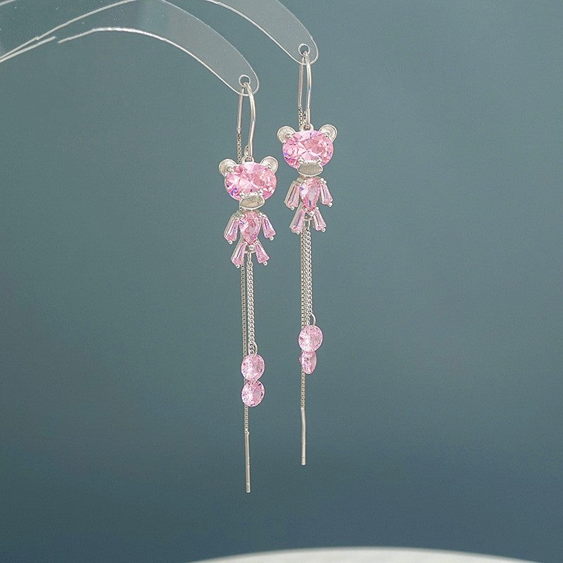 Sterling Silver Zircon Bear Tassel Threader Earrings