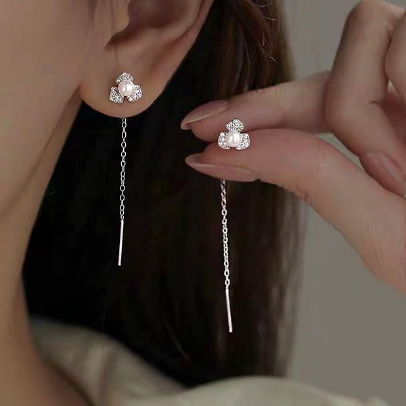 Sterling Silver Zircon Flower Leaf Threader Earrings